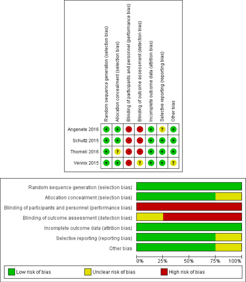 Figure 2 presents the risk of bias assessment of the included RCTs. There were low risk of attrition and reporting bias in all 4 RCTs. Selection bias were low in 3 studies and unclear in 1 studies. Performance bias were high and unclear in 3 and 1 studies, respectively.