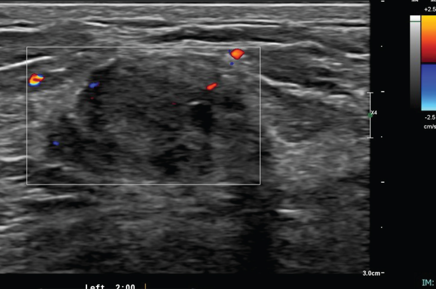 Figure 3: Ultrasound of left breast showing an irregular hypoechoic mass with indistinct margins seen at 2 o'clock. There associated mixed posterior features with peripheral vascularity. View Figure 3