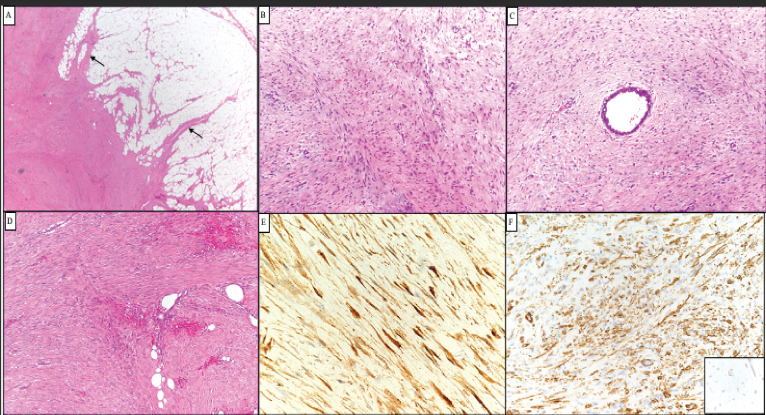 Figure 4: A) Representative photomicrograph of the tumors showing poorly circumscribed spindle cell neoplasm with finger like extensions into surrounding fat (A, arrows). The spindle cells are fairly uniform and exhibit fascicular arrangement; B) They surround epithelial structures and C) Fat; D) Tumor cells showed diffuse nuclear and cytoplasmic staining for beta catenin; E) They were also positive for smooth muscle actin; F) However desmin was negative (inset). View Figure 4