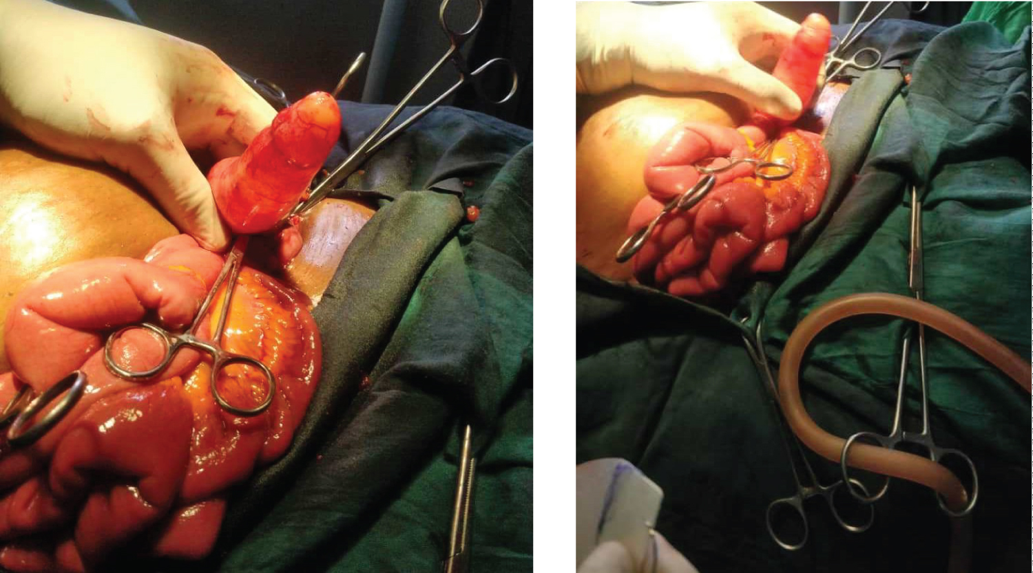 Figure 1 and Figure 2: Intraoperative finding of appendiceal mucocele with normal appendix base.