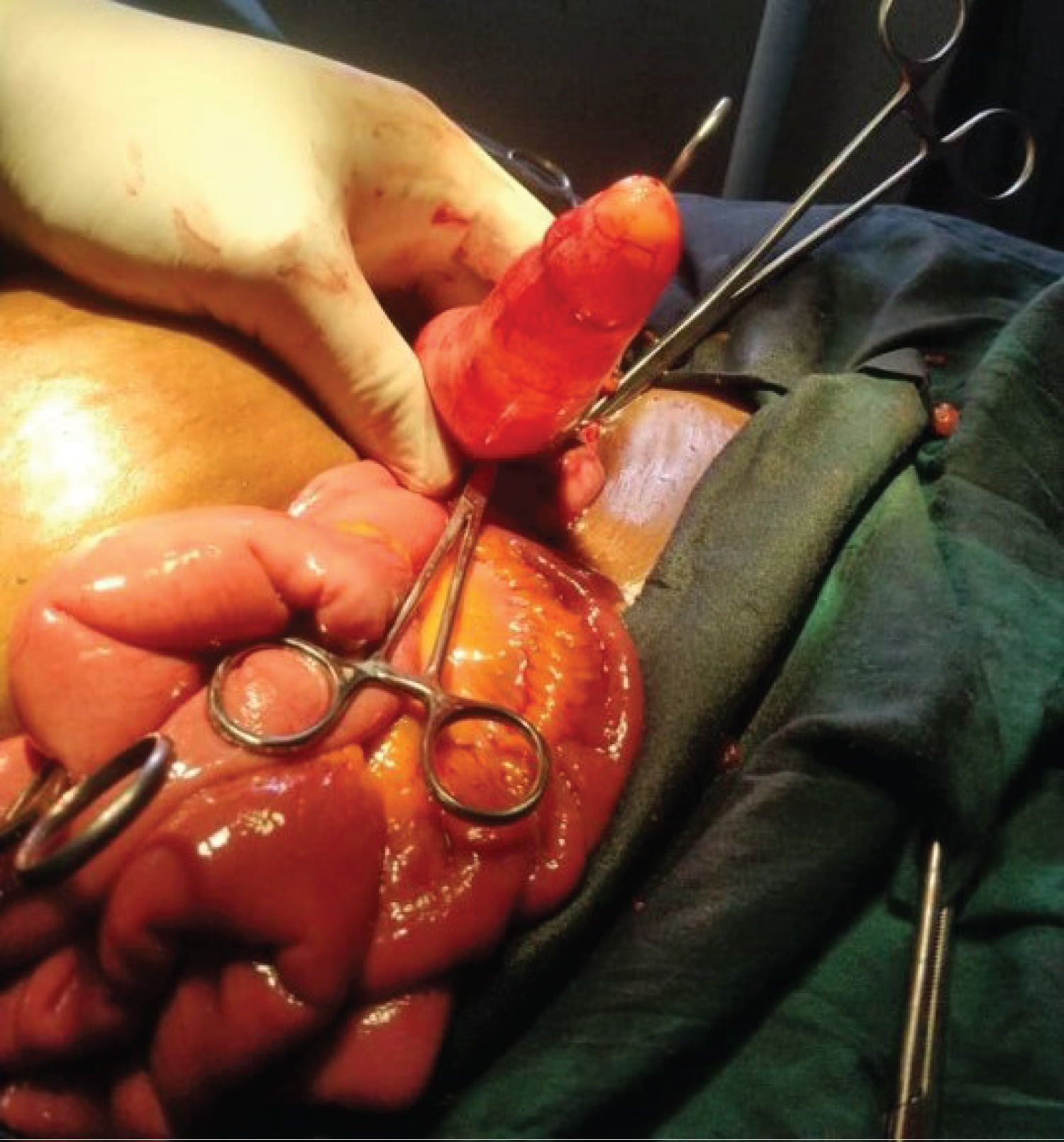 Figure 3: Intraoperative distended appendix with mucin without perforation.