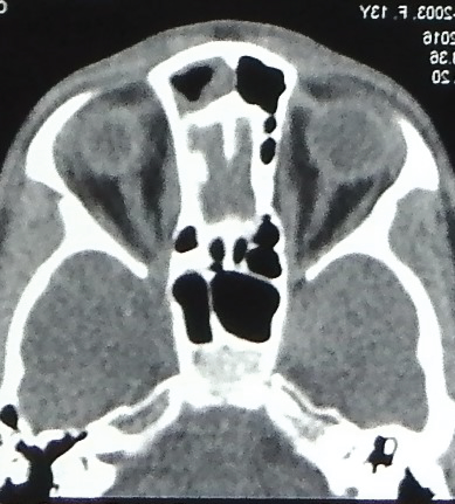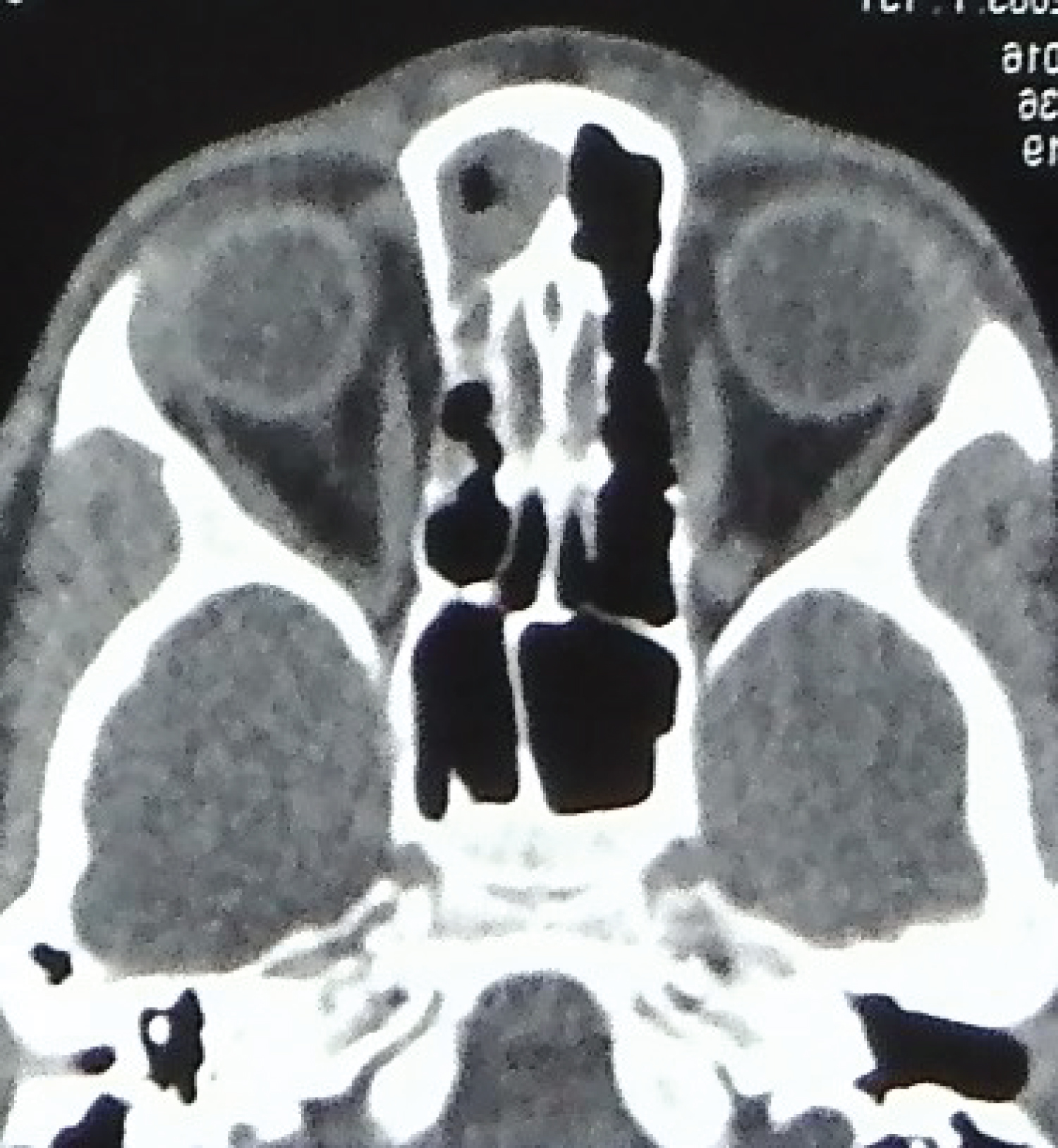 Figure 3: Axial cut of CT scan, showing fluid collection on dorsum of nose.