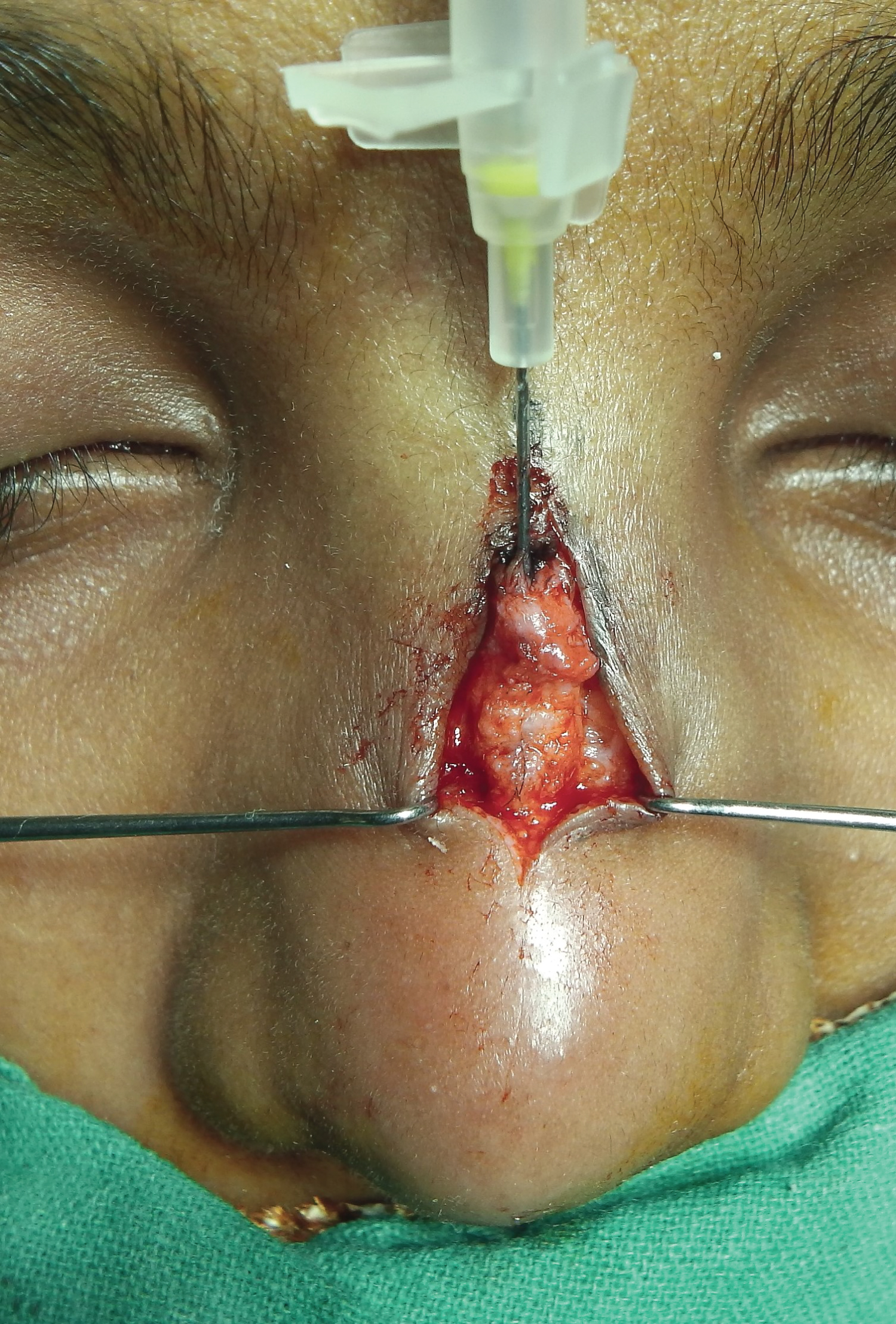 Patient was planned for excision of the NDSC. Written consent for photography, for publication of photographs and for surgery was taken. Neurosurgeon was kept on standby in case the track extended intracranially. The patient was taken under general anaesthesia. Sinus track was cannulated using 24 G cannula (Figure 5). 0.2 mL methylene blue dye was injected through the cannula. A vertical elliptical incision was given around the punctum and extended towards the sinus track (Figure 6). Careful sharp dissection was done around the track. 1.2 centimetre sinus track was excised in toto (Figure 7). After excision, no dye was seen in the field. There was open roof deformity in the nasal bones (Figure 8). A percutaneous osteotomy of nasal bones was performed. Layered closure of the incisions was performed.