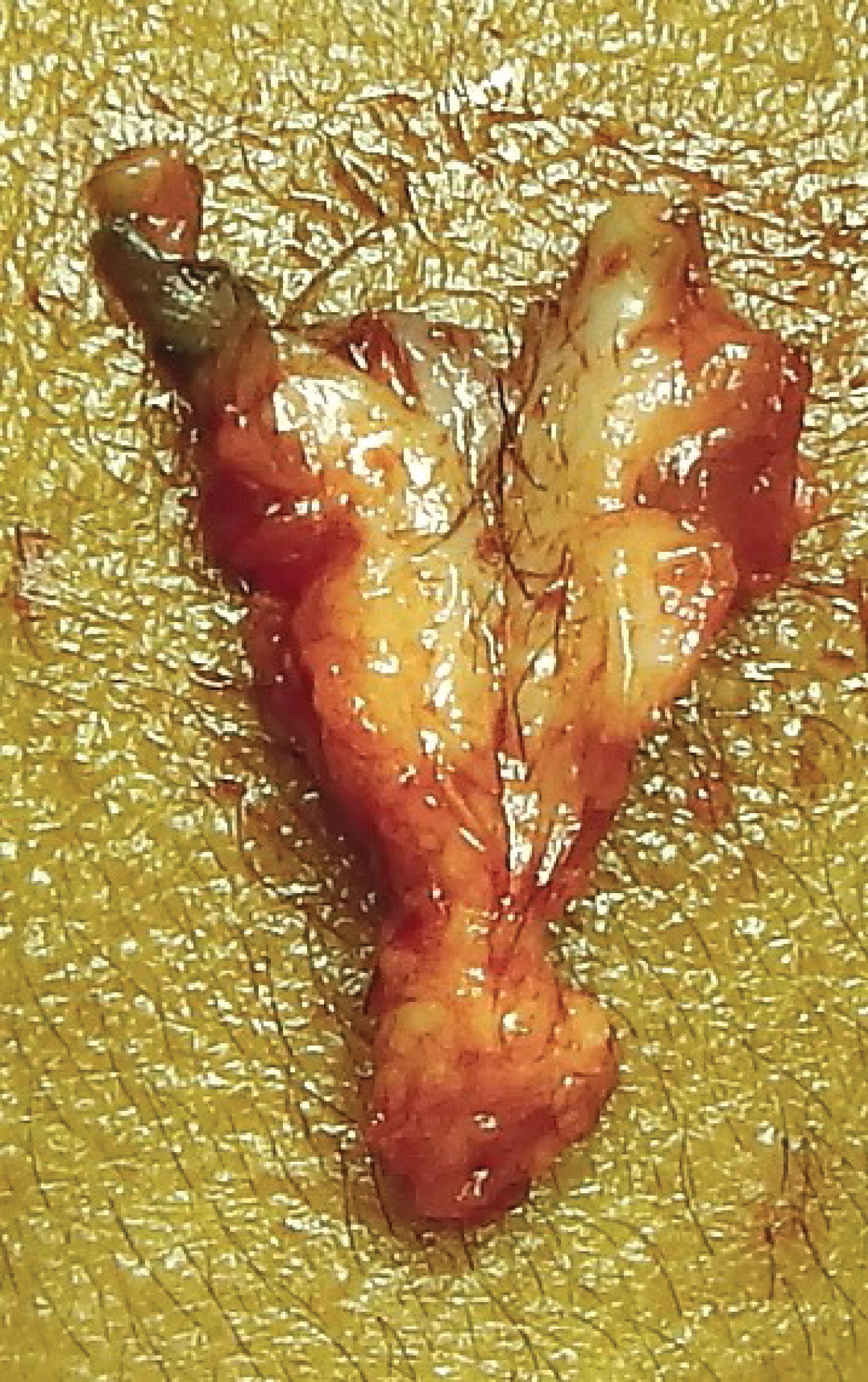 Result: Complete excision could be achieved. No complications or recurrence has been noted after more than a year.