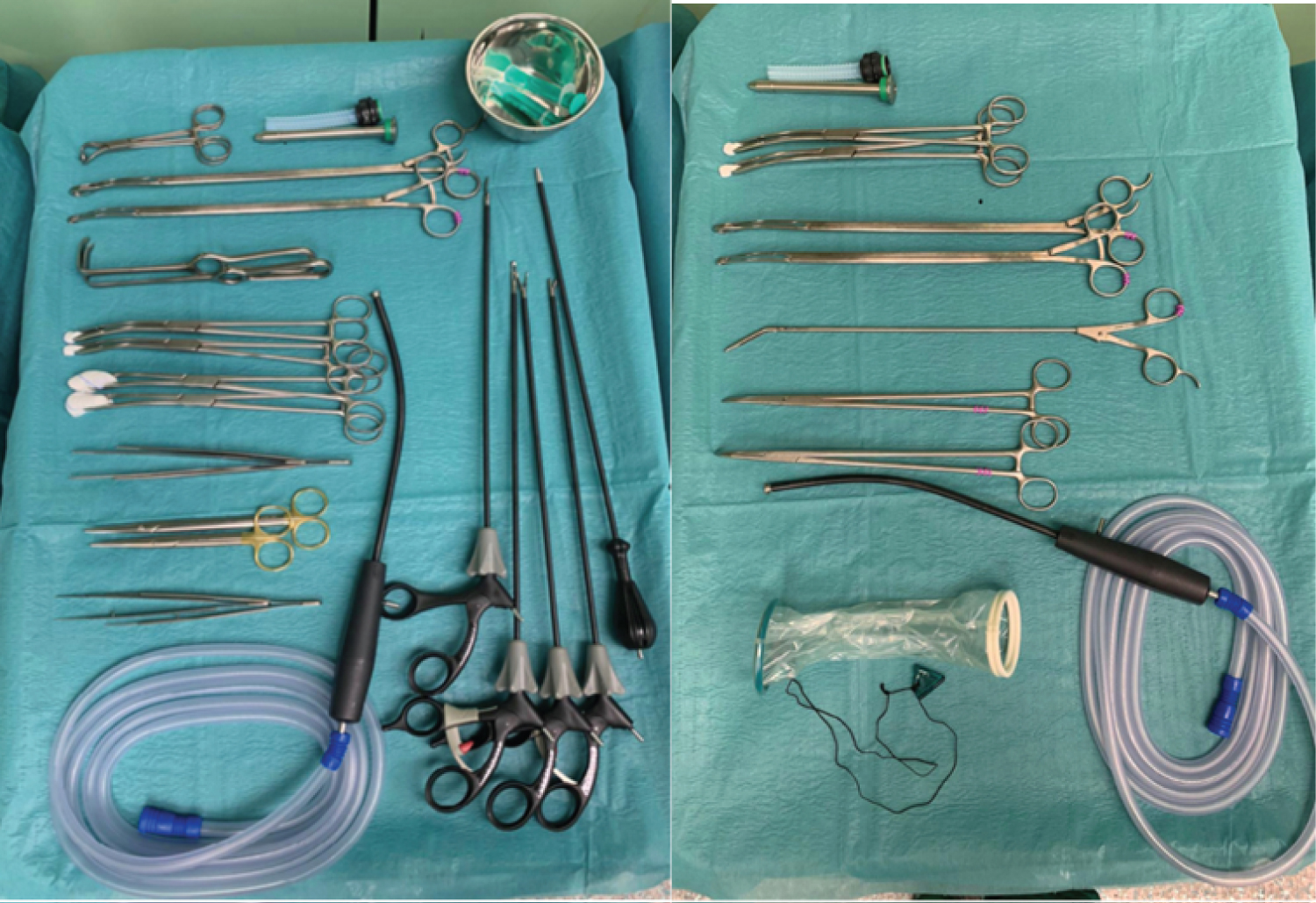 Figure 1: (A,B) The surgical instruments used during the performance of subxiphoid approach, such as duffner/aesculap or scanlan instruments, harmonic for sharp and blunt preparation of the hilar or interlobar structures, suction system, alexis ring protection folie.