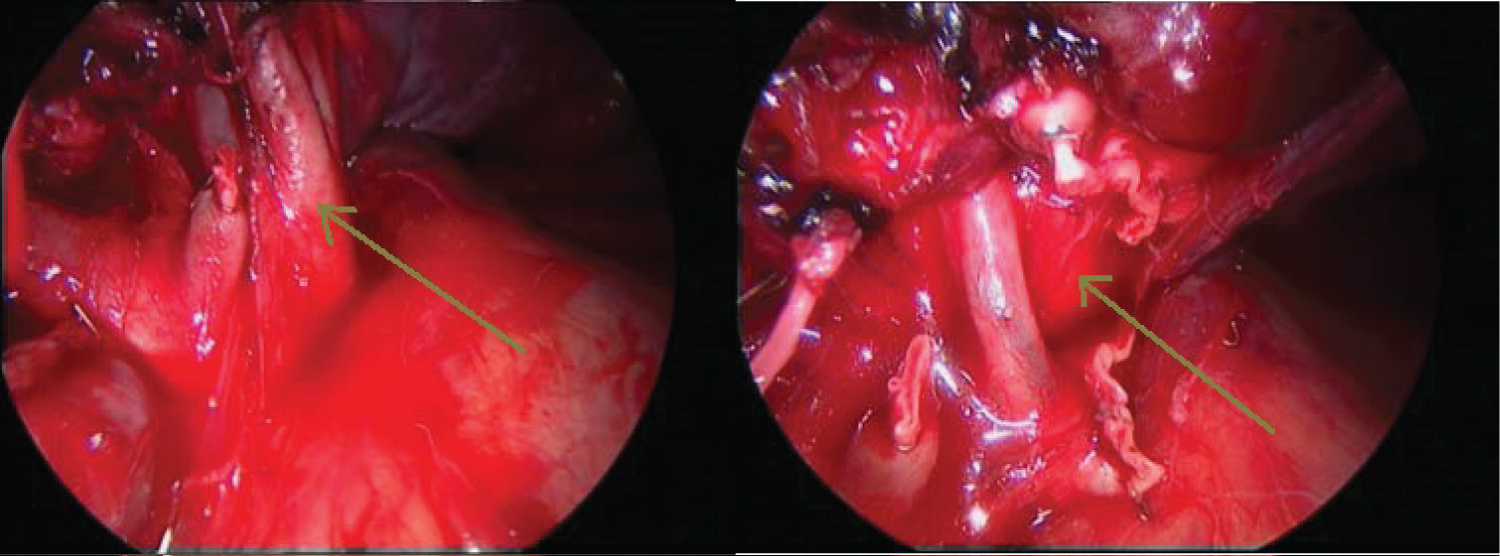 The approach on the left side showed more challenges than on the right side due to the position of the heart, specifically in the case of a hypertrophic heart, but the presentation and dissection of the hilus, blood vessels of both lobes, was as straightforward as the same procedure carried out on the right side. By carefully selecting the patients and evaluating heart size on the thoracic CT scan, these challenges can be avoided (Figure 5A, Figure 5B, Figure 5C and Figure 5D).