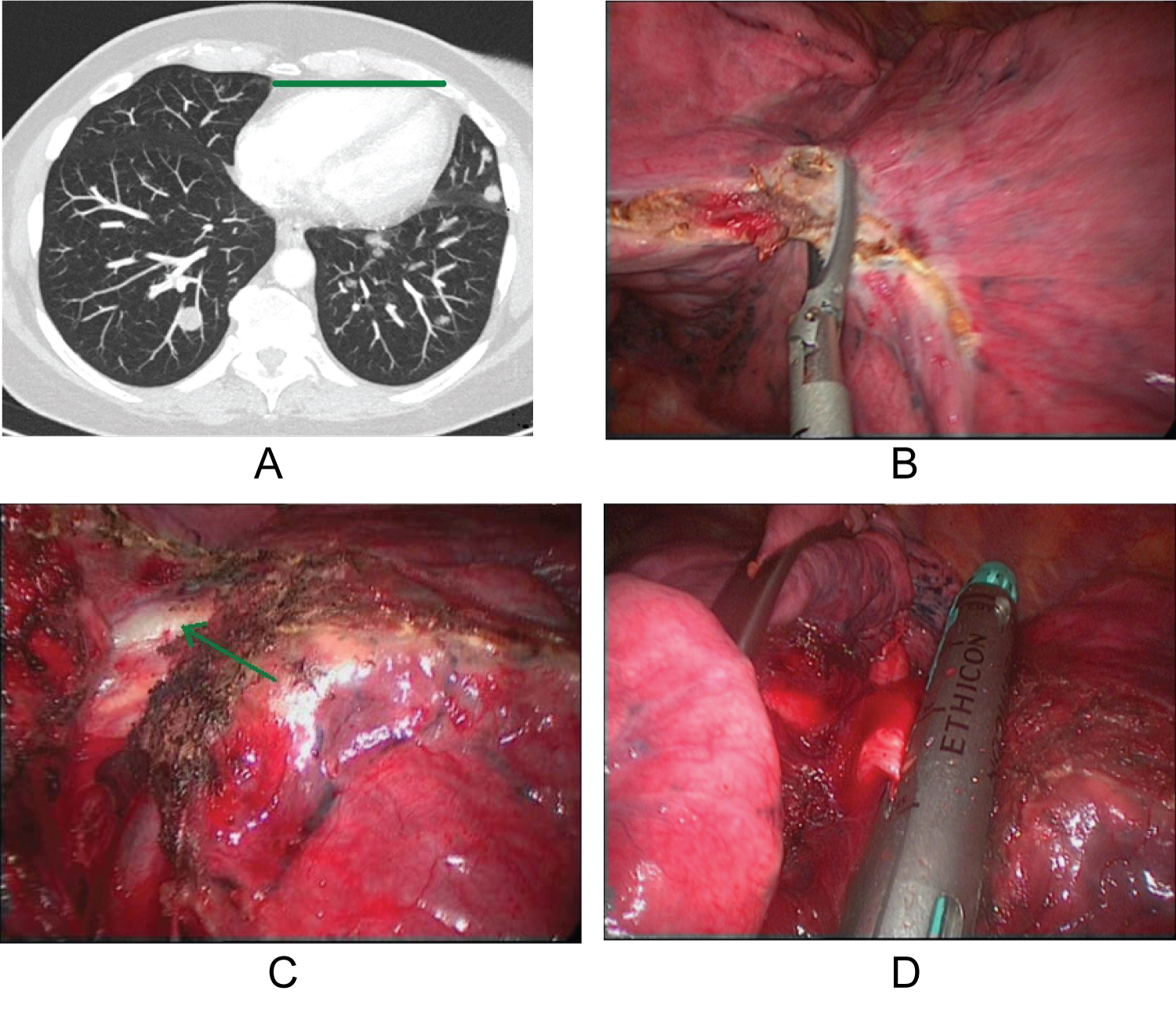 Figure 6: Patient has previously undergone heart surgery via sternotomy. Now the subxiphoidal duo-portal approach was used with right upper lobectomy and systematic lymphadenectomy. Addressing without problem the challenge of surgery with mediastinal adhesions.