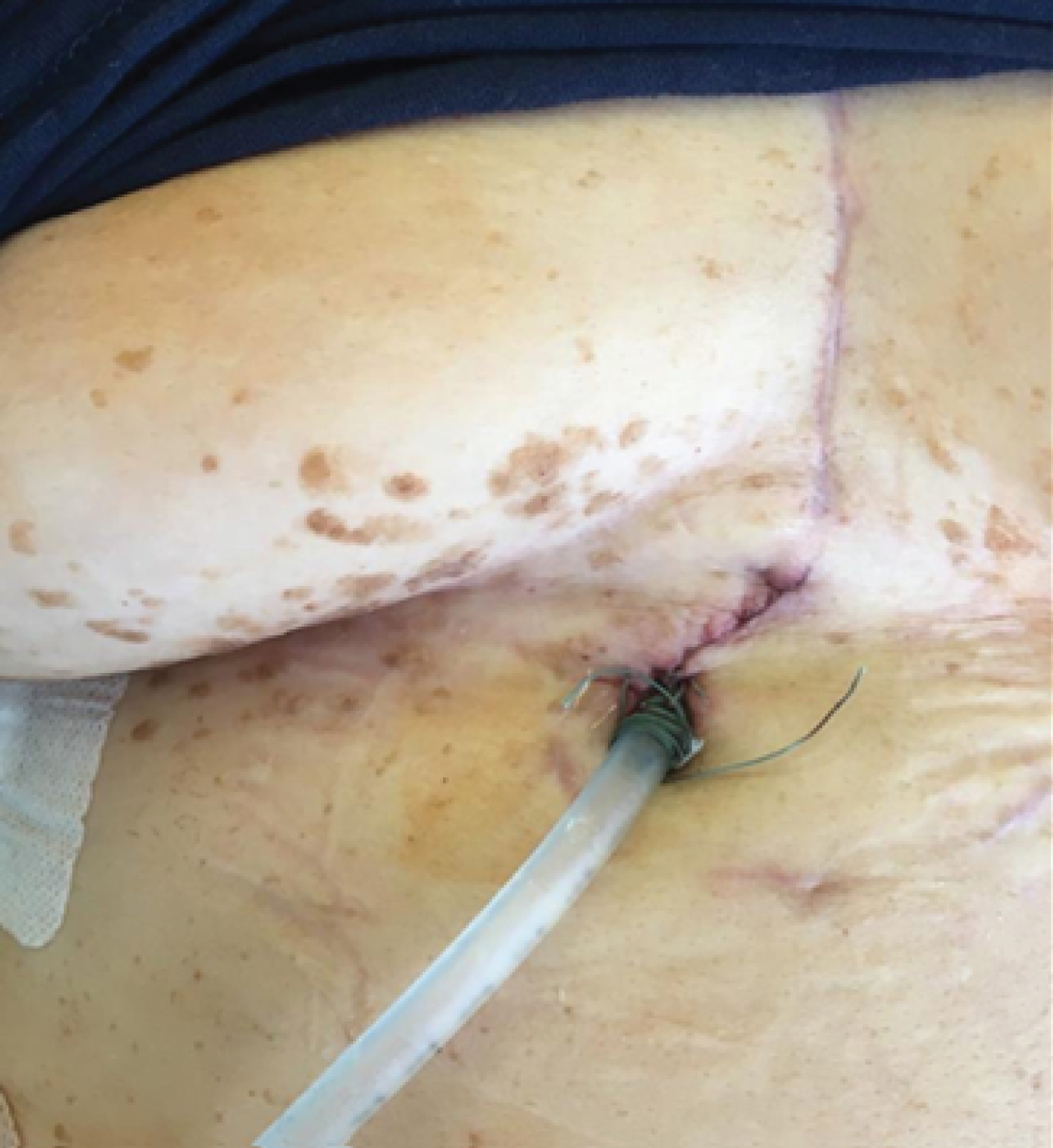 After inserting an XS Alexis O-ring, the operation can proceed. The use of a retractor is not necessary. By sparing the posterior fascia of the rectus abdominis muscle, there is virtually no danger of abdominal herniation or weakness of the abdominal muscles, and bleeding from the epigastric vessels can also be avoided. Thoracic drainage is also achieved via the subxiphoidal approach thus preventing damage to the neurovascular bundle in the intercostal space, which subsequently significantly reduces postoperative pain. The wound closure takes place layer by layer with final intracutaneous suture and hydrocolloid dressing (Comfeel-Plus) in the area of the lateral camera incision. After placing a U-shaped suture and fixing the chest drainage, the layered wound is finally closed with Donati-suture method (Figure 3A, Figure 3B, Figure 3C and Figure 3D).