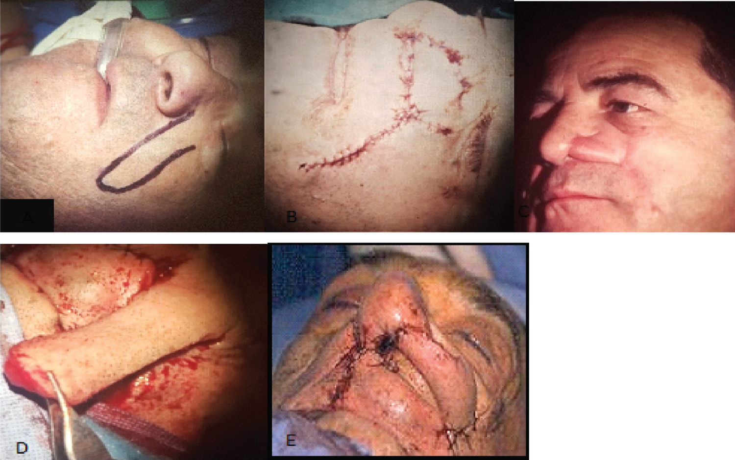 Figure 3: Nasal cavity melanoma with invasion of soft tissues, periorbita and skull base (A,B,C) Resection; (C,D) Midfrontal and Mustarde flaps reconstruction; E) Postoperative after radiotherapy and before sectioning the pedicle of the midfrontal flap.