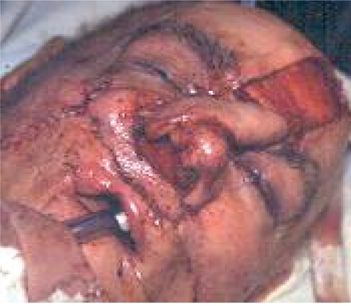 In a patient with a mediofrontal flap, the donor bed could not be closed, leaving a sector of the frontal bone exposed, which required a third surgical procedure in which a rotating scalp flap was used to repair the defect.