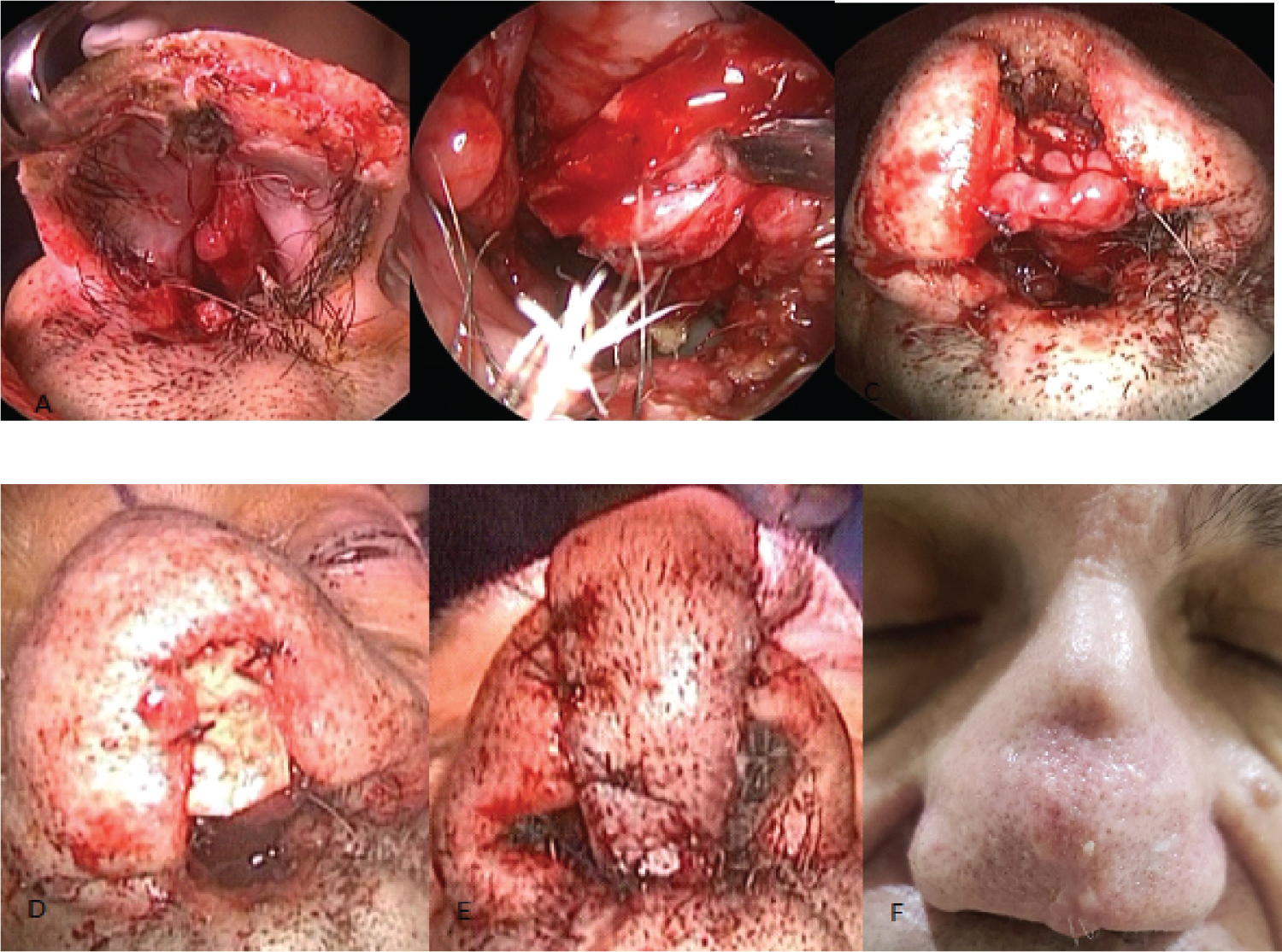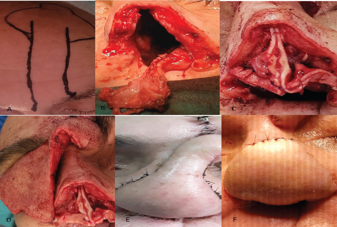 Figure 4: Multilayer nasal reconstruction (A) Rhinectomy; B) Mucosal reconstruction with lateral wall flap; C,D) Auricular concha cartilage graft; E) Midfrontal flap; F) Postoperative at 15 months.