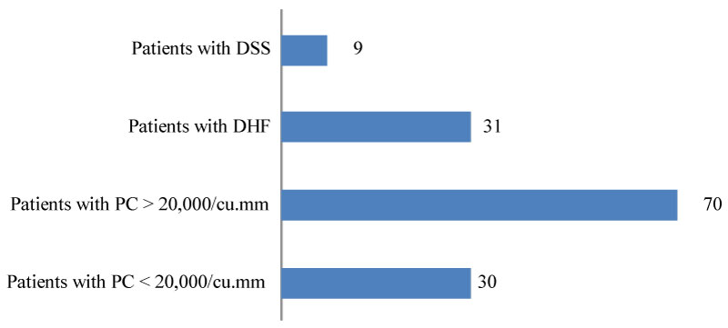 There were total 100 patients included in the study. Among them 30 patients developed thrombocytopenia below 20,000/cu.mm at any point of time. In the rest 70 patients platelet count was maintained above 20,000/cu.mm. 31 patients developed DHF. DSS was seen in 9 patients (Figure 1).