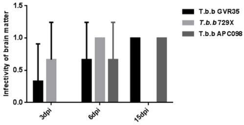 In this study the infectivity was used to determine the onset of blood brain barrier traversal. An infectivity greater than 0.5 was taken to imply that trypanosomes were more likely to begin crossing the blood brain barrier at that time point. The results show that at 3 dpi the 'infectivity' or 'occurrence' of infective trypanosomes in the brain parenchyma for T.b.b GVR35, T.b.b 729X and T.b.b APC098 was 0.33, 0.67 and 0 respectively (Figure 1). This implies that only T.b.b 729X was more likely to begin crossing the BBB at 3 dpi. At 6 dpi the 'infectivity' of T.b.b GVR35, and T.b.b APC098 was 0.67 while that of T.b.b 729X was 1 suggesting that the onset of BBB traversal for T.b.b GVR35 and T.b.b APC098 is 6 dpi. Thus the onset of BBB traversal for T.b.b 729X remains the earlier one (3 dpi) whereas that of T.b.b APC 098 andT.b.b GVR35 is 6 dpi.