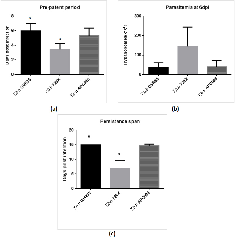 Different groups of mice were infected intramuscularly with 3 × 103 trypanosomes respectively and their pre-patent period (panel a), parasitemia at 6 dpi (panel b) and persistence spans (panel c) recorded. The data ± SEM represent three replicate experiments and were analyzed using One-way Anova or Unpaired t-test. T.b.b 729X had a pre-patent period significantly lower than T.b.b GVR35 (*P < 0.05) or T.b.b APC 098 and presented the highest parasitemia in the first six days and also a significantly (*P < 0.05) shorter persistence span and thus considered to be the more virulent than the other two. There was no significant difference between the pre-patent period and persistence span of T.b.b APC 098 and those of T.b.b GVR35 (P > 0.05). Thus T.b.b 098APC is a mildly virulent field isolate and its virulence is comparable to the lab strain (T.b.b GVR35).