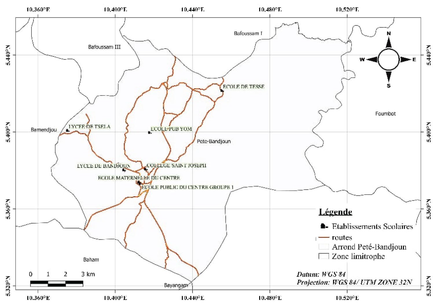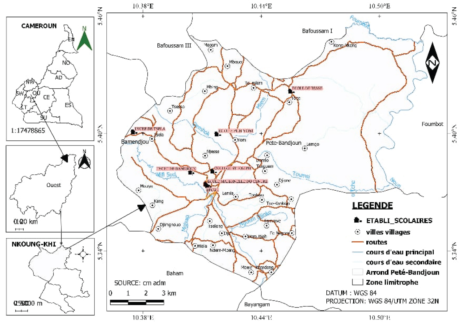This study took place in Bandjoun (Figure 1) during the months of February to March 2019. Poumougne is located in the Department of Koung-Khi West Region-Cameroon (Figure 2). Bandjoun is limited to the North by Bafoussam I and Bafoussam III. In the South by the municipalities of Demdeng and Bayangam; to the East by the council of Foumbot and to the West by Bamendjou and Bafoussam III. This Sub-Division covers an area of approximately 115 km2 for a total population of approximately 47,405 inhabitants [8]. Figure 2 shows the map of schools choosen at random.