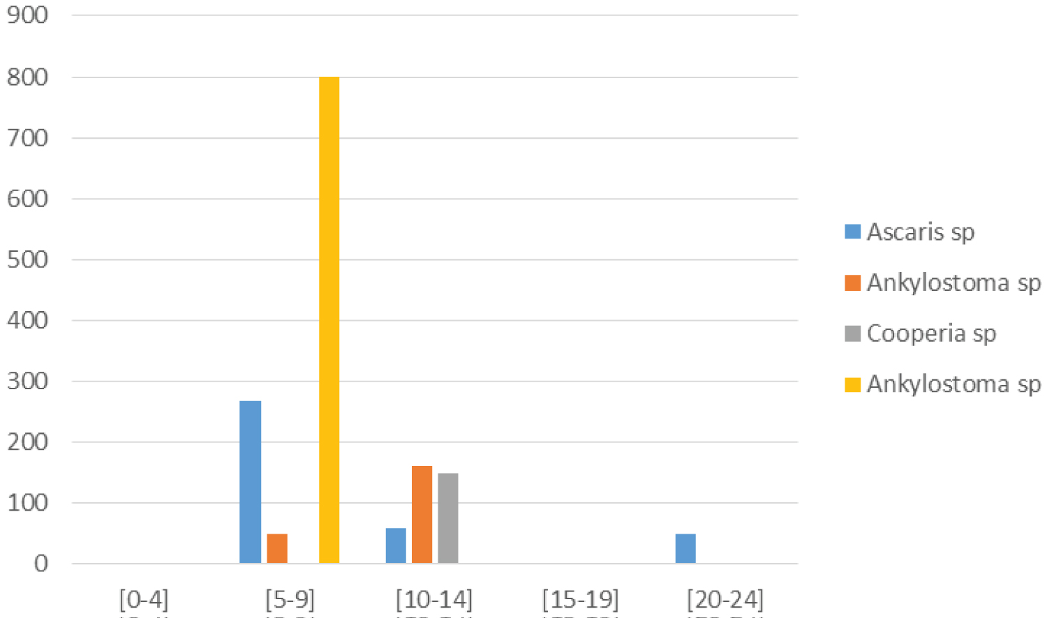 Figure 5 shows the intensity of helminthic infection according to age group. The intensity of Ascaris and Ankylostome did not with age. Cooperia was present only in children aged between 10-14 years-old and Trichuris trichiura in children aged between 5-9 years.