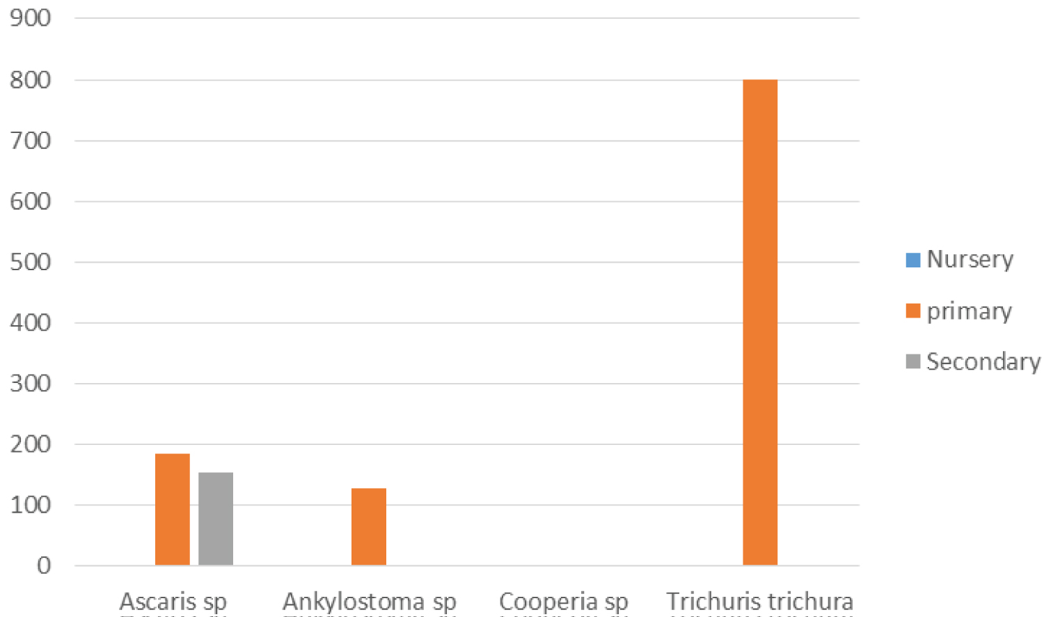 The intensity of helminthic infection with respect to level of formal education is revealed in Figure 6. The intensity of infection of Ascaris varies in terms of school level. The primary school pupils had an intensity of infection between 0-200 EPG. Trichuris trichiura had the highest intensity of infection 800 EPG among primary school pupils. While a zero intensity rate was recorded for the Nursery and secondary schools except for Ascaris lumbricoides for secondary schools.
