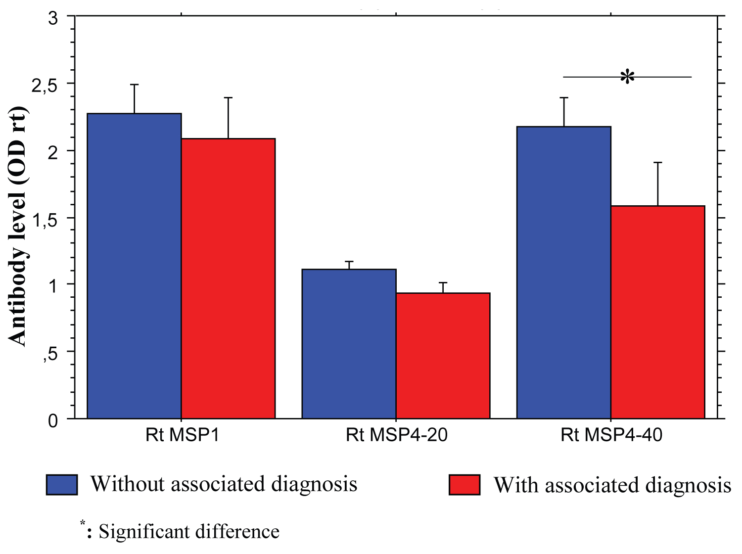 Figure 2: Comparison of anti-MSP1, MSP4-20 and MSP4-40 IgG levels of patients hospitalized for severe malaria at the infectious and tropical department of Fann university hospital, depending on the presence or not of an associated diagnosis.