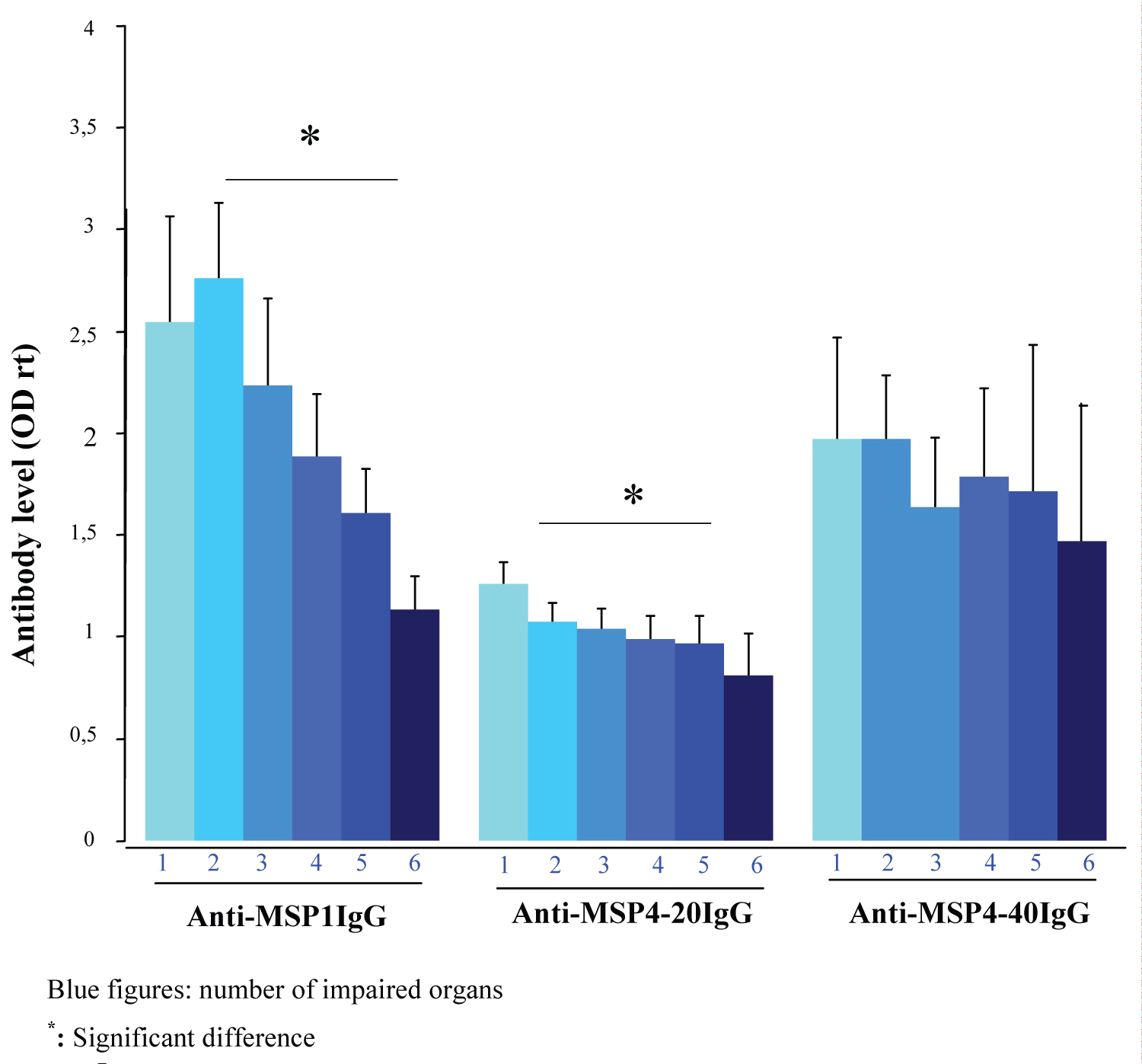 Figure 4: Comparison of anti-MSP1, MSP4-20 and MSP4-40 IgG levels of patients hospitalized for severe malaria at the infectious and tropical department of the Fann university hospital, depending on the number of impaired organs.