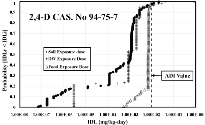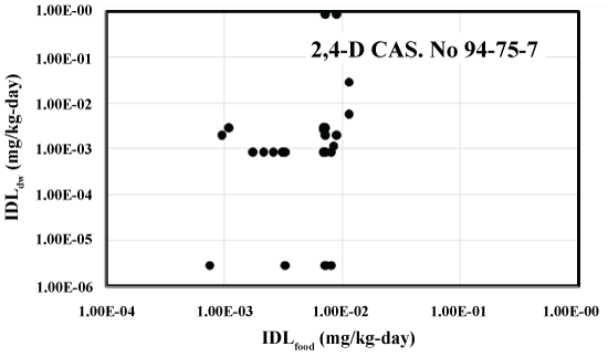 For those 14 current largely used pesticides and 11 Stockholm Convention POPs, IDLs computed from major exposures were illustrated as CDF and relationships between IDLs in two major exposures were explored. 2,4-D, Chlorpyrifos, and Lindane IDLs analyses were conducted in this study.