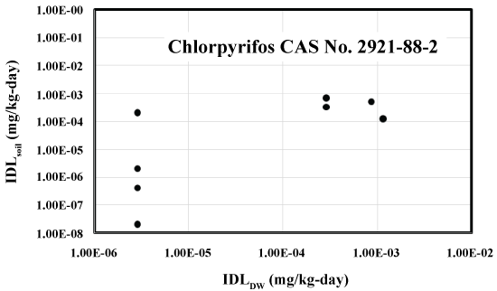 Figure 6: Relationship between computed Chlorpyrifos IDLs from drinking water MCLs and soil RGVs.. View Figure 6