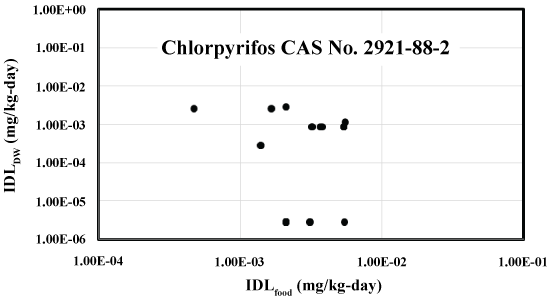 Figure 7: Relationship between computed Chlorpyrifos IDLs from drinking water MCLs and commonly consumed agricultural commodities MRLs. View Figure 7