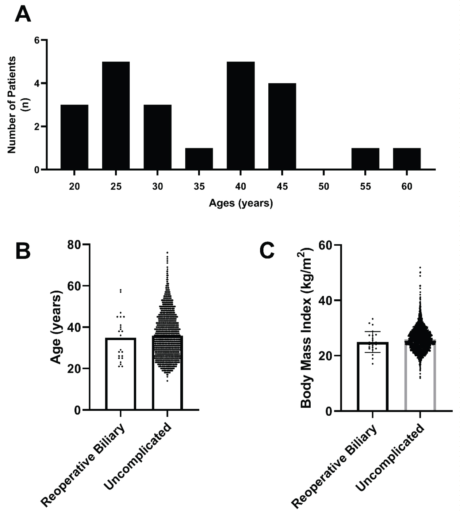 Figure 2: Age and BMI in relation to biliary complications. A) Histogram representation of biliary complications by age; B) Age distribution for uncomplicated and re-operative living donations; C) BMI distribution for uncomplicated and re-operative living donations.