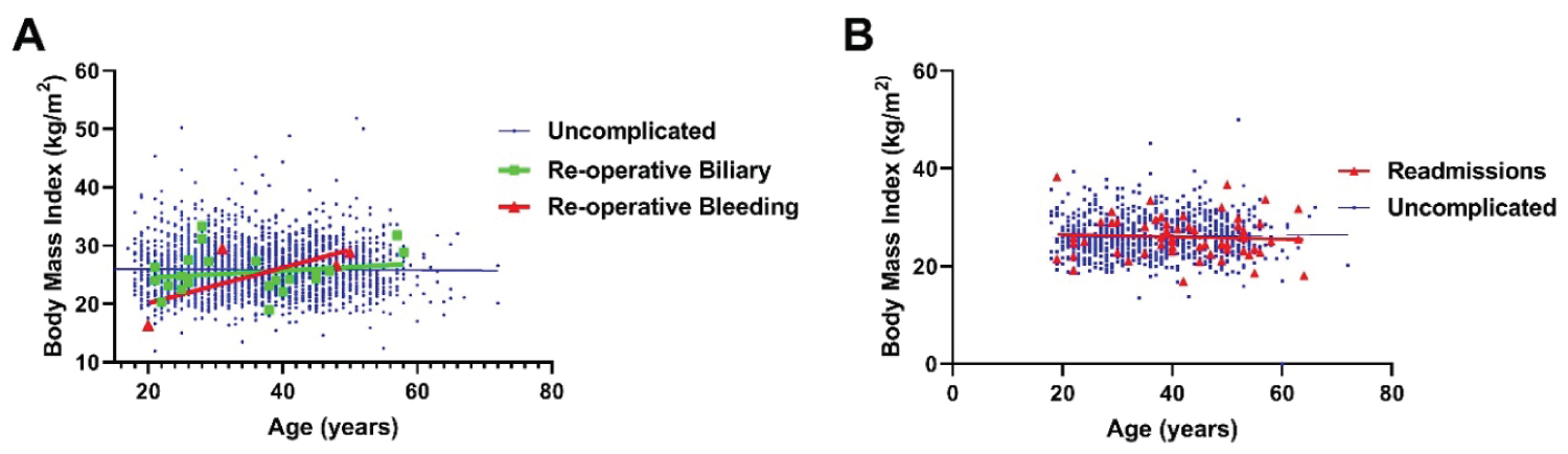 We first assessed overall management of the LDLT cohort and found an overall readmission rate of 7.1%. (Table 1B). Upon further investigation, the most common indications for readmission were non-specific complaints such as nausea, pain, constipation (n = 21) and unspecified reasons (n = 28) as illustrated in (Table 2). The overall complication rate requiring intervention aside from biliary or vascular complications was 7.2%. (Table 1C) The overall need for re-operation (all causes) was 1.9%, with the most frequent indication being biliary complications for the entire cohort. Biliary complications overall were 3.5%. of whom 23 patients required re-operation. 43 in total required re-operation, including 6 for vascular complications. Higher age did not predispose to operative complications, though it was associated with a higher rate of readmission (Figure 1A). No such relationship was found for BMI (Figure 1B).