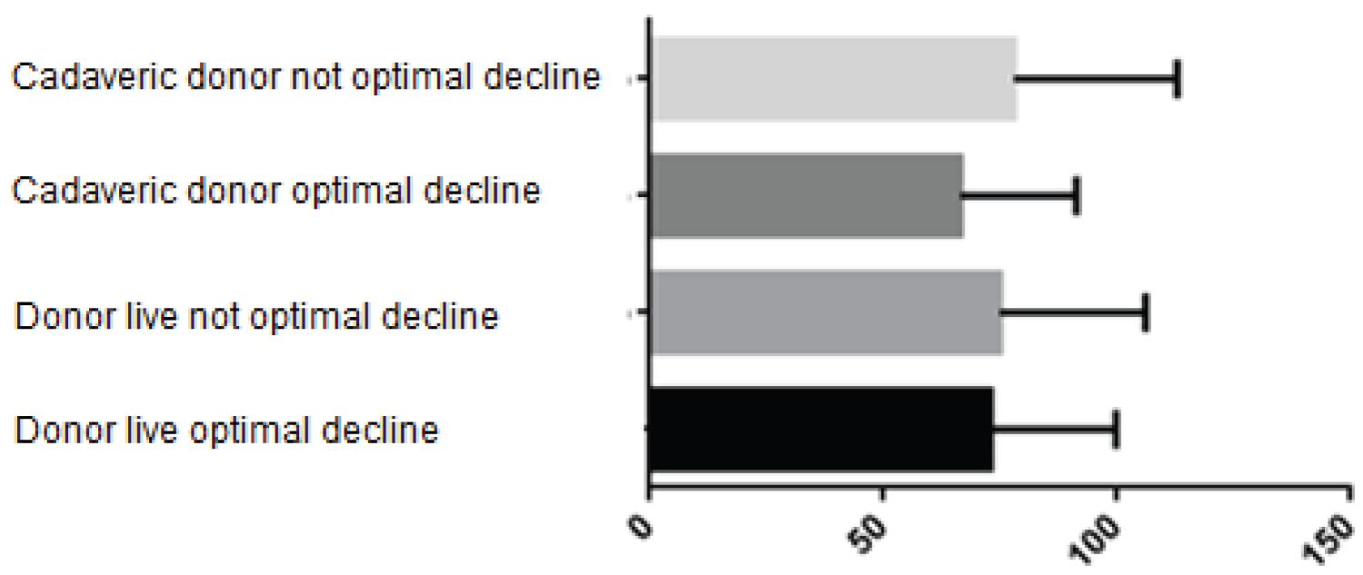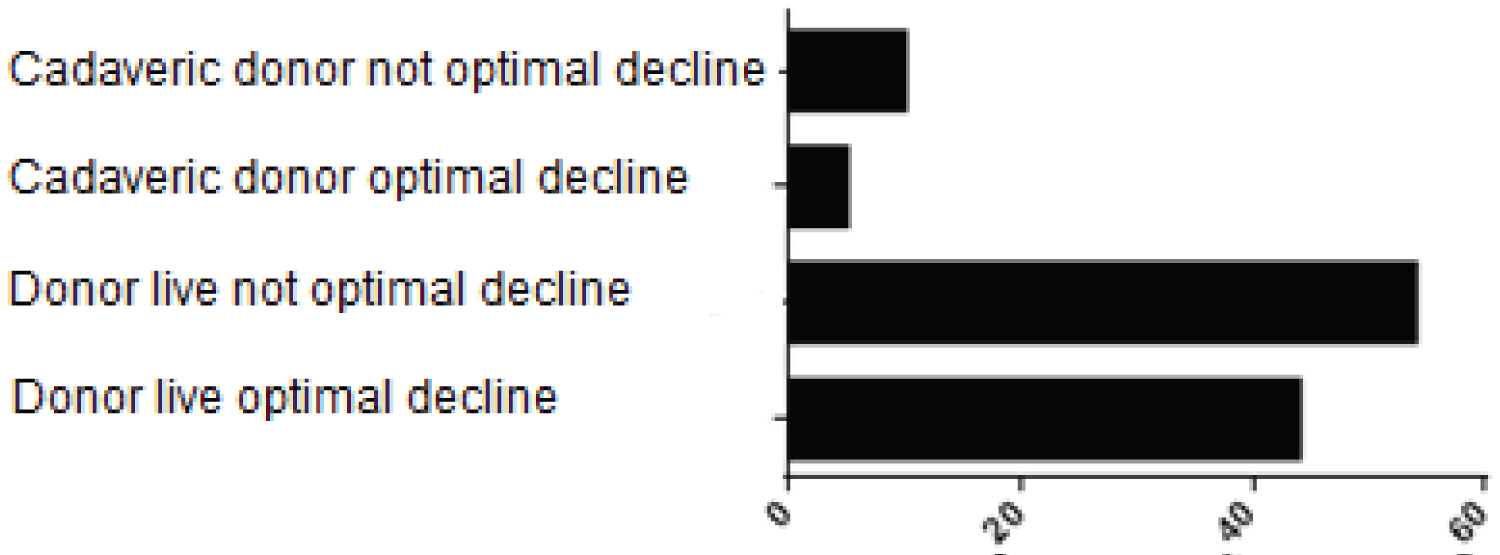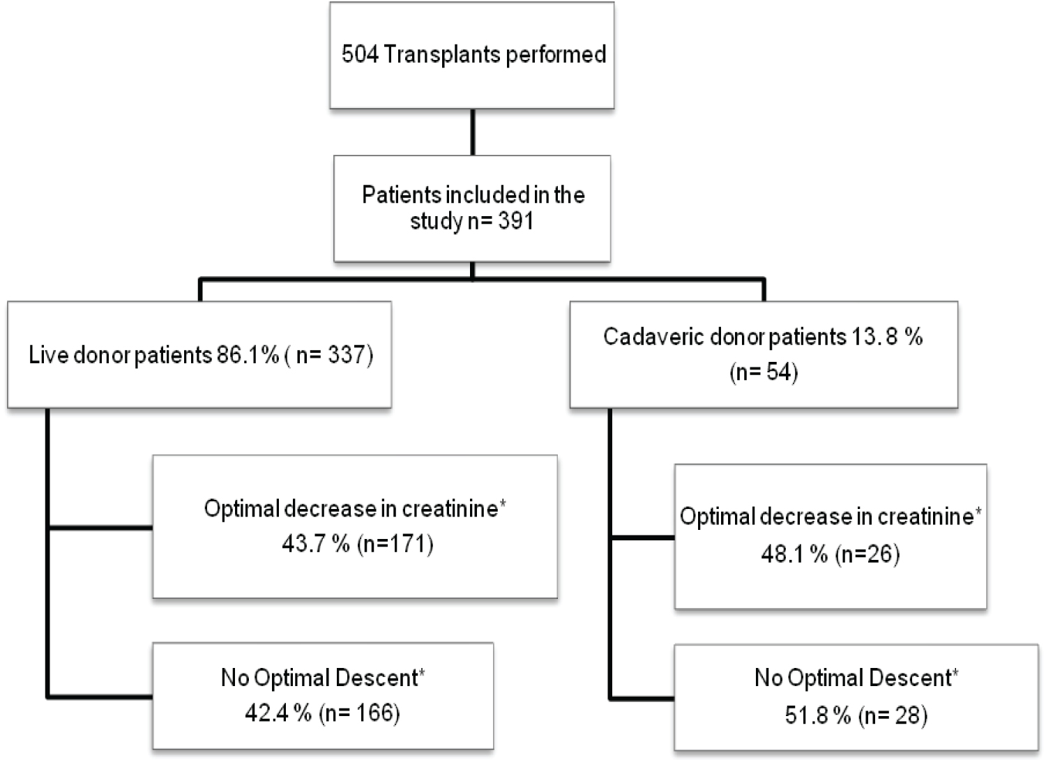 In the study period, 504 kidney transplants were performed. 391 patients entered the study because the rest had not completed their clinical file, of them 337 (86.1%) received kidney graft from a live donor and 54 (13.8%) from a cadaveric donor. In the case of live donor transplantation, 171 patients (43.7%) had optimal creatinine decrease translated as values below 2.5 mg/dl at 72 hours after surgery and 166 patients (42.4%) had a non optimal decrease. When the donor was cadaveric, 26 patients (6.6%) had optimal creatinine decrease, values below 3 mg/dl in the first 72 hours and 28 patients (7.1%) had no optimal decrease (Figure 1).