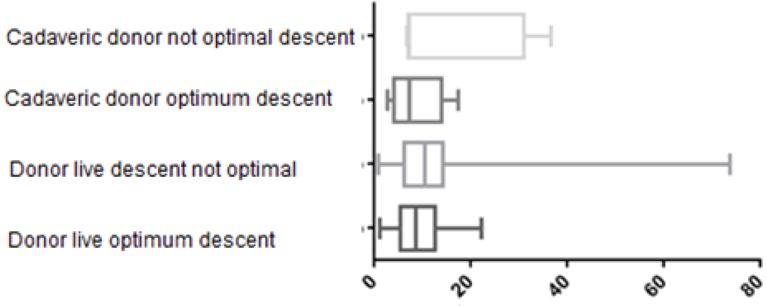 The decrease in creatinine is expected in the first hours after transplantation, considering an optimal decrease in the live donor at 24 hours of 25% of the presurgical value, at 48 hours at least decrease of 30% more and at 72 hours levels below of 2.5 mg/dl. In the cadaveric donor recipient, the expected decrease at 24 hours is at least 10%, in 48 hours, 10% more and at 72 hours maximum creatinine levels of 3 mg/dl. In addition, in any type of donor, non-optimal levels of creatinine decrease are considered at values below 10% per day for 3 consecutive days or the increase in creatinine values on any day of the postoperative period, diuresis less than 1 liter in 24 hours on the first day or less than 75 ml/hr in the first 2 days, together with the urgency of dialysis in the first 72 hours [10].
