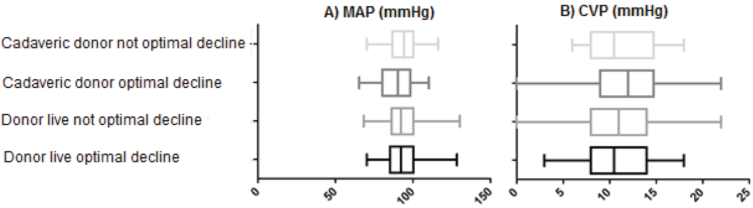 MAP during graft reperfusion had no significant difference (p = 0.1088) in the same way as CVP (p = 0.9) (Figure 7).