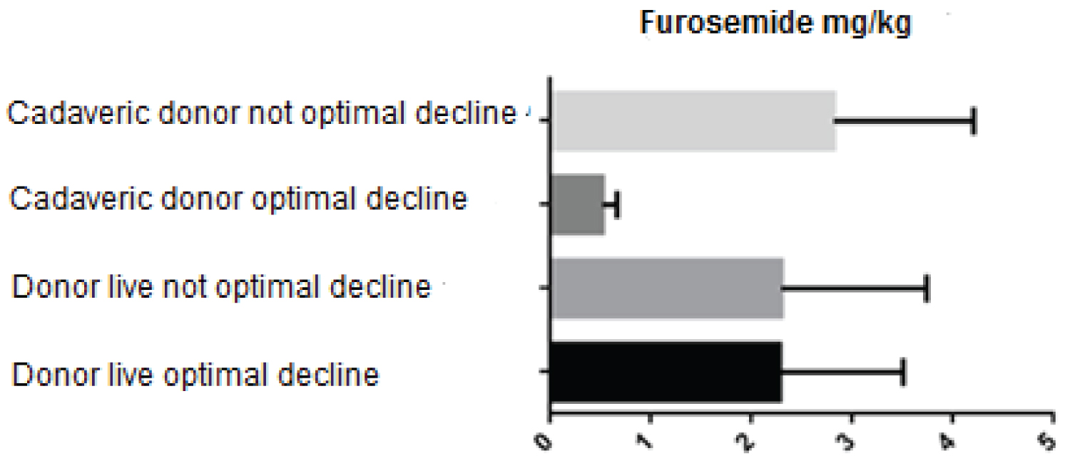 The use of diuretics is not mandatory, two randomized controlled studies showed that there is no benefit in using furosemide in patients with renal failure and oliguria, but more studies focused on renal recipient patients are needed [8]. In this study, we found that the use of furosemide had a negative effect on the optimal decrease in creatinine with statistical significance p = 0.0001 related to doses higher than 2 mg/kg; that is, the non-optimal decrease in creatinine was related to the use of doses above 2 mg/kg of furosemide.