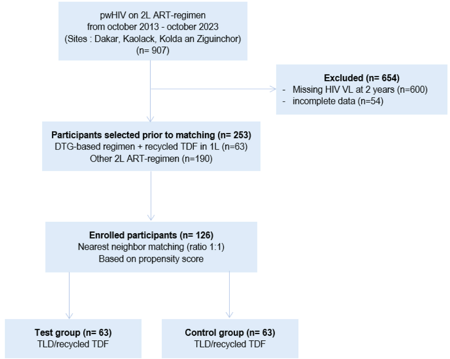 For this study, we considered adults (> 18 years) who were switched to a second-line ART regimen between October 1, 2013, and October 30, 2023. Patients who underwent at least two years of follow-up since first-line ART failure were eligible for inclusion. We excluded participants who had missing viral load data at the endpoint. Participants were divided into two groups: The test group, which included those who recycled TDF and XTC with DTG in their second-line ART regimen, and the control group, which included individuals receiving the standard of care (SOC: ritonavir boosted protease inhibitor (PI/r) or DTG + 2NRTIs with a rotation of nucleosides and no prior history of exposure to TDF).
