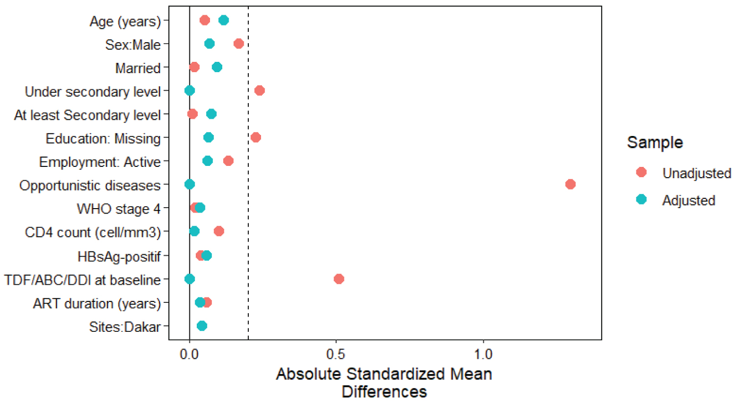 To reduce the effect of selection bias, we performed a 1:1 ratio nearest neighbour propensity scores matching analysis between the test and control groups. Propensity scores were estimated by using a logistic regression model adjusted for age, sex, marital status, education level, income-generating activity, and history of opportunistic diseases, including tuberculosis, WHO stages, CD4 count, HBsAg positivity, first-line ART regimen, and site of follow-up. The obtained matched dataset was then checked for balance using standardized mean differences (SMDs) with the margin for optimal balance set at 0.2. Based on previous studies [19-21], we assumed that 80% of participants in the test group and 90% in the control group would have a viral load suppression of less than 400 copies per millimeter. With a noninferiority margin of -12% and a unilateral alpha risk of 5%, we calculated that 126 participants (63 per group) would provide 90% power to show noninferiority. Noninferiority was considered when the lower limit of the one-sided 95% confidence interval (CI) of the absolute difference in viral load suppression rates between groups was greater than -12%. We used the Dunnett-Gent chi-square test to compute the noninferiority p values.