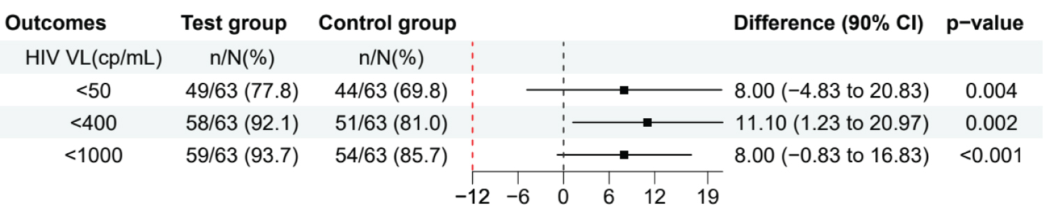 At the 48-week endpoint, 51 (81.0%) PLHIV had a viral load < 400 copies in the control group compared to 58 (92.1%) in the test group (difference: 11.10% 95% CI [1.23-20.97], p = 0.002), which met the prespecified noninferiority criterion (Figure 4).