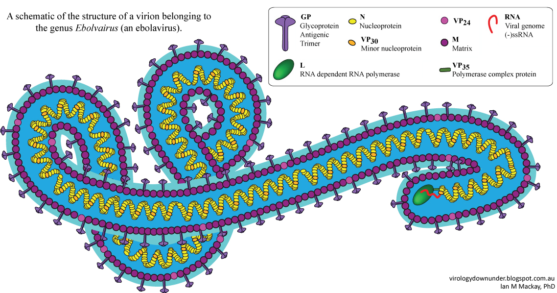 Figure 1: Schematic of the structure of a virion belonging to the genus Ebolavirus by Dr. Ian M Mackay [2].