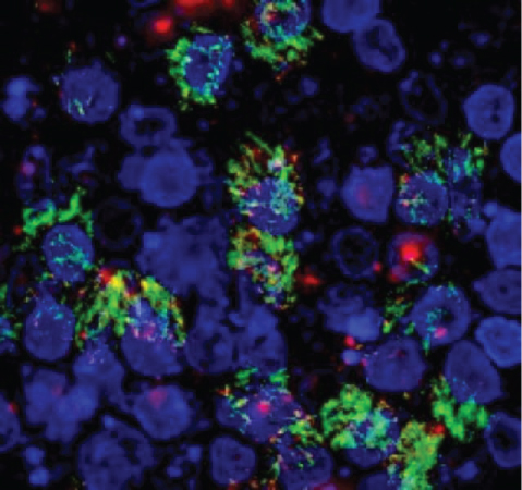 Figure 3: Illustrates Cellular protein TIM-1 acts as a receptor for Ebola virus and Marburg virus. Microscope image shows TIM-1 expression (in green) on the surface of human airway cells. Image Credit: University of Iowa [6].