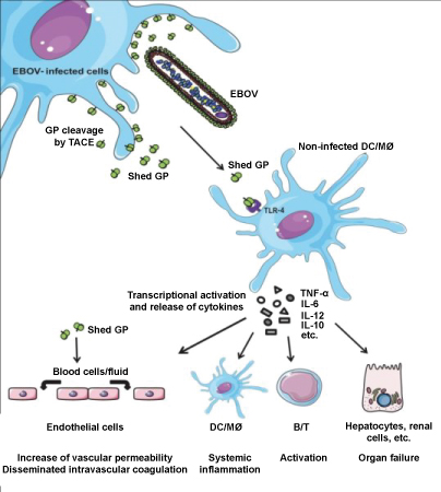 Ebola virus has seven genes, one of them is called GP, codes for two related proteins: a shorter secreted one and a longer one that extents the viral wall and sticks out of its surface. Throughout virus infection, some of the surface GP is cut off and is subsequently shed from contaminated cells. High levels of both shed and secreted GP are originated from the blood of infected humans and animals. Scientists [7,8] found that shed but not secreted GP that can bind to immune cells that are called macrophages and dendritic cells both are the targets of Ebola virus infection. Upon binding of shed GP, these immune cells start freeing massive quantities of immune modulators. Both shed GP and these immune modulators are soluble proteins that may transmit in the blood stream and this may demonstrate how continuous creation and release of shed GP an original immune response to the virus gets more worst and leading to high fever, massive inflammation and possibly the jolt that kills many Ebola patients.