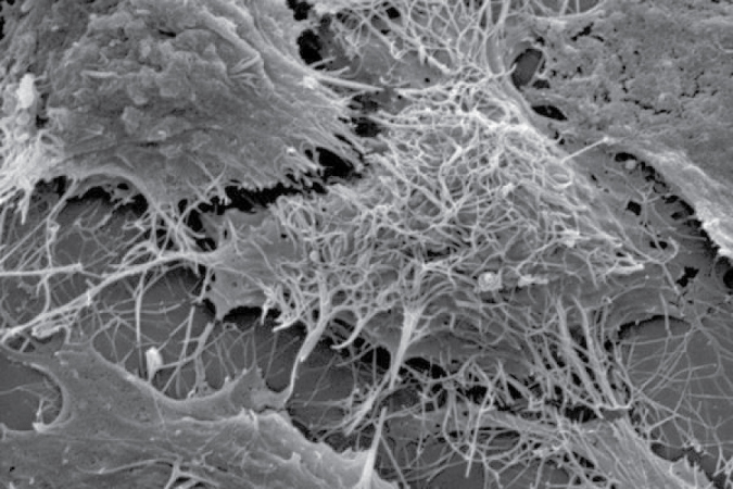 Figure 5: Illustrates scanning electron microscope image of Ebola virions (spaghetti-like filaments) on the surface of a tetherin-expressing cell (center). Image Credit: Paul Bates, PhD, University of Pennsylvania School of Medicine [9].