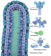 Figure 6: Illustrates Cross section through Ebola virus demonstrates proteins in blue, green and magenta, the RNA genome in yellow, and the membrane in light purple. Atomic structures are shown on the right, with portions that have not been determined shown with schematic circles [12].