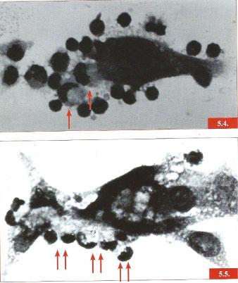 Figure 1: Figures 5.4 5.5. Early photographs of historical value taken in 1969 to show the attachment of small compact T lymphocytes and the newly discovered large granular lymphoid cells to autologous tumor cells (1969) [1]. Reproduction by Schenk Buchverlag [4]. View Figure 1