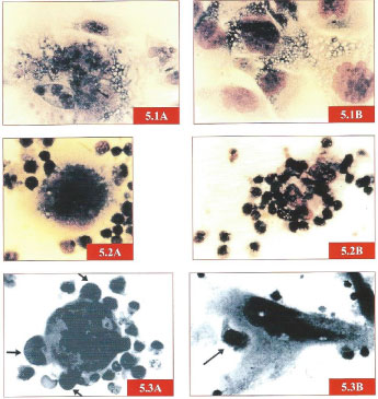 Figure 2: Figures 5.1A-5.3B. Patient with chondrosarcoma mobilizes small compact T lymphocytes to destroy his autologous tumor cells (colored pictures). Normal control (JGS) T lymphocytes practice emperipolesis but do not attack; large granular lymphoid cells (arrows) firmly attach and eventually lyse target tumor cells (B&W pictures). One the first pictures of human NK cells in the literature (1969) [4]. Reproduced in [3]. View Figure 2