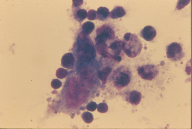 Figure 3: Figure of target sarcoma cell attacked by small compact immune T cells and large granular NK cells releasing minuscule granules to penetrate and lyse the cell membrane of the target sarcoma cell. Donor patient LN #90641 with metastatic liposarcoma in remission was immunized with PR8 viral oncolysate vaccine prepared from the targeted sarcoma cells (presented patient in Sinkovics, Plager, Papadopoulos, et al. MD Anderson Hospital, Year Book Medical Publisher 1977; 267-288) [15,16]. Reproduced by Schenk Buchverlag [4]. View Figure 3
