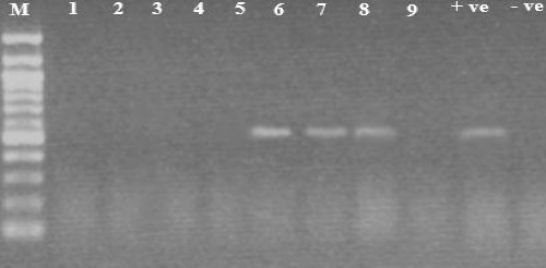 Figure 1: HPV-16 DNA results (512bp) on 1.5% agarose gel. Lane M shows 100 bp DNA marker, lane 11 shows negative control, lane 10 shows positive control, lanes 1, 2, 3, 4, 5 and 9 show negative results, lanes 6, 7 and 8 show positive results. View Figure 1
