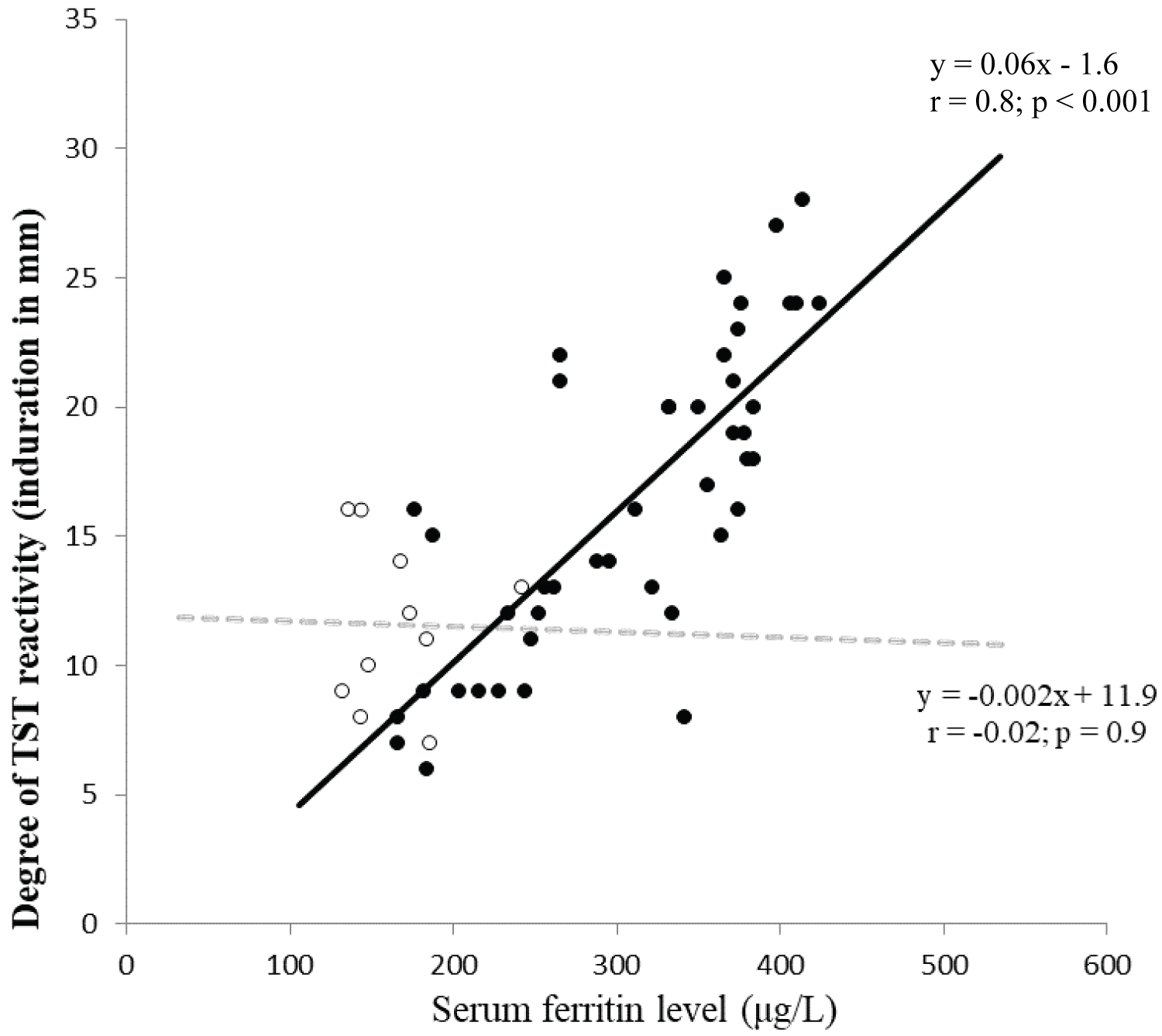 Figure 2. Correlation between serum ferritin level (μg/L) and degree of TST reactivity (induration diameter in millimetre).