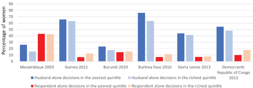 This study is a comparative cross-sectional analysis of de-identified data from the Demographic and Health Surveys (DHS). We requested permission to use these publicly available datasets from The DHS Program. The six sub-Saharan African countries included in this analysis were countries that had the lowest human development indices in addition to having available datasets at the time of analysis. The Human Development Index (HDI) is a summary measurement on key dimensions of human development including life expectancy, knowledge, and standard of living [30]. The HDI ranks 188 countries with higher numerical rankings reflecting lower index scores and human development (Norway is number one, Niger is number 188). The countries with available datasets and the highest HDI rankings (lowest index scores) included the following DHS surveys: Democratic Republic of Congo 2013 (ranking 176), Mozambique 2003 (180), Sierra Leone 2013 (181), Guinea 2012 (182), Burkina Faso 2010 (183), and Burundi 2010 (184). These countries have both high gender inequality as well as low economic development. The discrepancies in the years of the surveys reflect variation in when the surveys were conducted and which questionnaire modules were included that year, as female healthcare decision-making sections are not included in every DHS round.