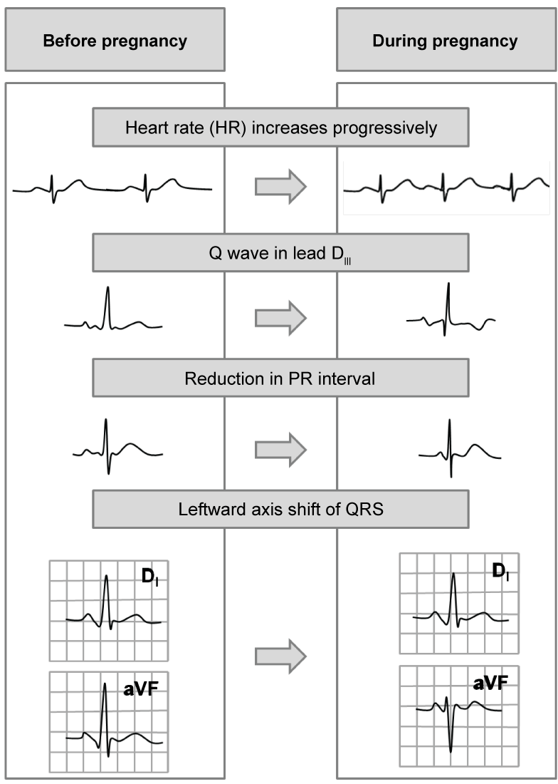 Pregnancy may induce some ECG changes which may regress later in pregnancy or following delivery [7,38-48]. Main ECG changes induced by pregnancy are reported in Figure 2.