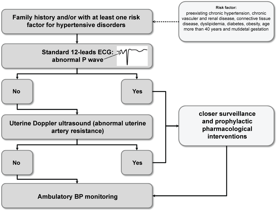 In the first stage, women with family history of hypertensive disorders during pregnancy or with at least one major risk factor for these conditions (preexisting chronic hypertension, chronic vascular and renal disease, connective tissue disease, dyslipidemia, diabetes, obesity, age more than 40 years and multifetal gestation) should be referred to a specialist to perform a standard ECG in the first trimester of pregnancy. The presence of an abnormal P wave morphology identifies women at high risk for the development of hypertensive disorders during pregnancy. Among those with normal P wave morphology, an uterine Doppler ultrasound with their fetal anatomy scan may be performed to better stratify the risk (specialist referral). Of the women referred for a specialist opinion, ABPM may be also performed during pregnancy to detect masked hypertension and to evaluate pulse pressure and night-time BP.