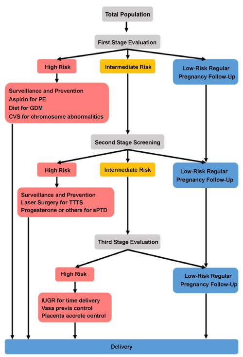 At the second evaluation by ultrasound and markers, a selected proportion of those identified then to be at high risk are directed to special surveillances and prevention. These includes TTTS separation by laser surgery, preterm delivery prevention with progesterone or other means, close surveillances by ultrasound, monitoring biomarkers for IUGR, and preventing term PE by metformin or methods to recover the normal balance of pro and anti-angiogenic factors, and to diet or insulin to prevent GDM. Those at low risk are directed to regular pregnancy follow up until delivery.