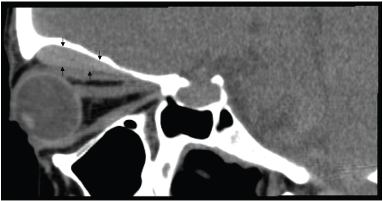 Figure 1: Hematoma on the left upper orbit (black arrows) on orbital CT.
